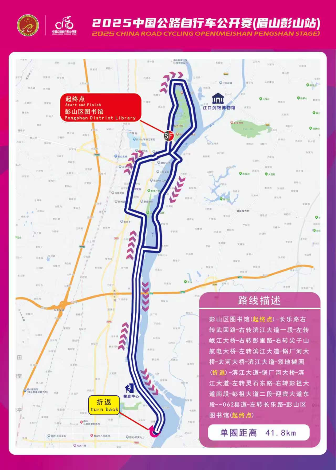 此次比赛路线为彭山区图书馆(起终点)-长乐路右转武回路-右转滨江大道一段-左转岷江大桥-右转彭里路-右转尖子山航电大桥-左转滨江大道-锅厂河大桥-太和大桥-滨江大道-领地樾园(折返)-滨江大道-锅厂河大桥-滨江大道-左转灵石东路-右转彭祖大道南段-彭祖大道二段-迎宾大道东段-长寿牌坊-长寿路-左转长乐路-彭山区图书馆(起终点),往返共41.8公里。骑行者将沿着岷江追风逐景,在绿水青山间感受负氧离子环绕。